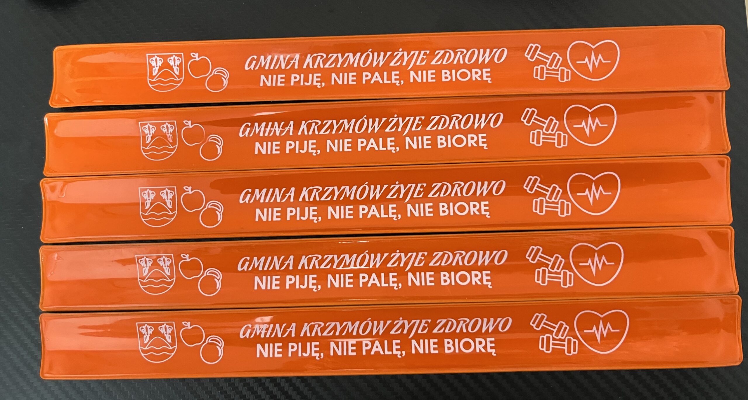 Opaski, które dzięki umieszczonym na nich hasłu: Gmina Krzymów Żyje Zdrowo – Nie Piję, Nie Palę, Nie Biorę”, jednocześnie promują życie bez nałogów. W ostatnim etapie projektu były rozdawane w szkołach na przełomie listopada i grudnia. A jest to czas, kiedy najbardziej mogą się przydać z powodu szybko zapadającego zmroku.